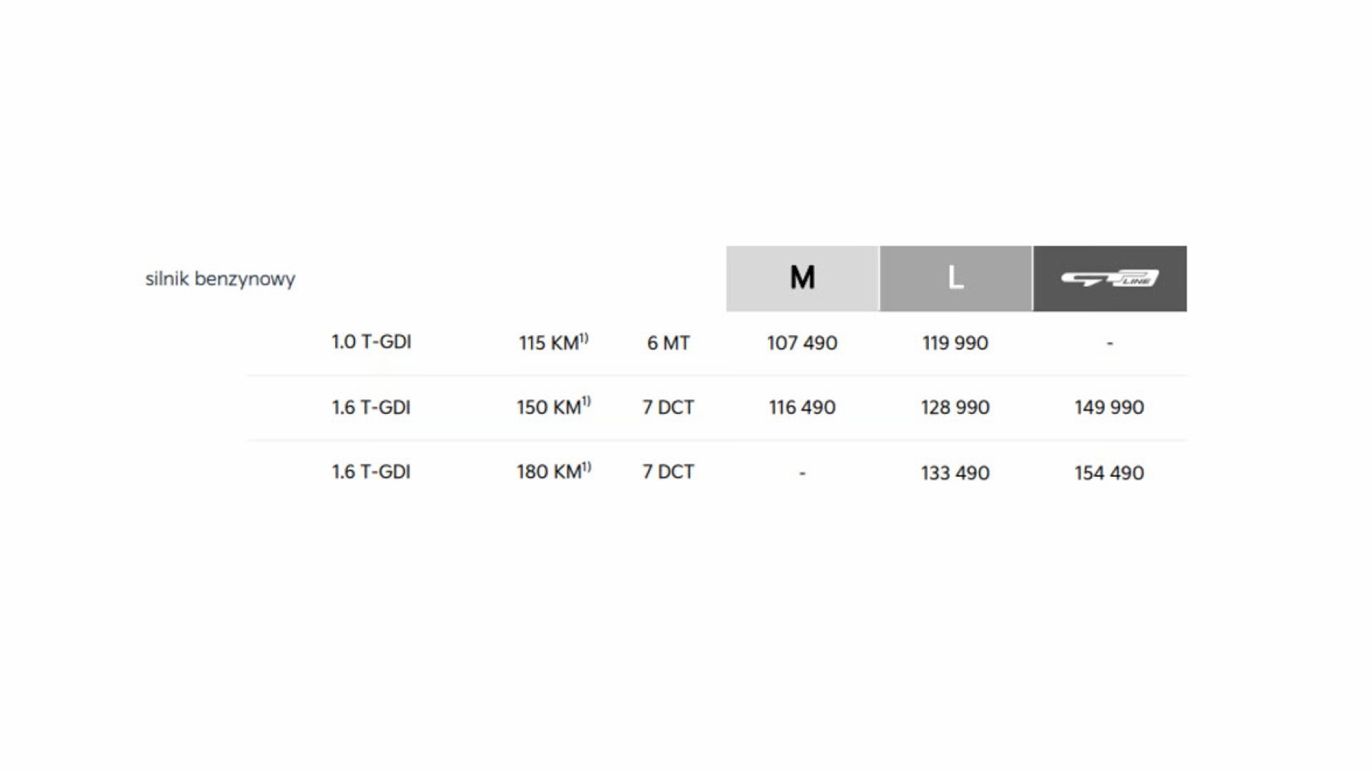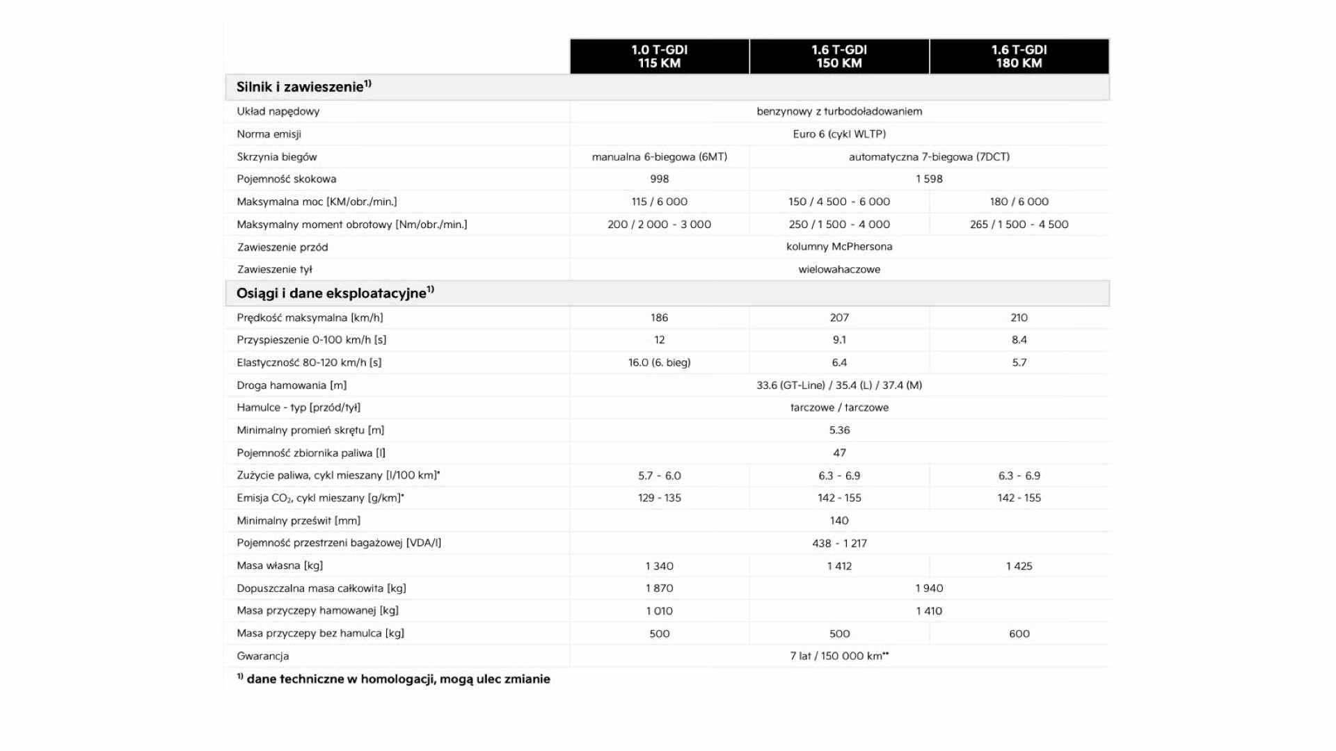 Oferta rozpoczyna się od benzynowego silnika 1.0 T-GDI (115 KM) z 6-biegową przekładnią mechaniczną. Silnik 1.6 T-GDI jest dostępny z przekładnią dwusprzęgłową (7DCT) i oferowany w dwóch wersjach mocy – 150 KM i 180 KM. W 2026 roku gama układów napędowych zostanie rozszerzona o pełną hybrydę.