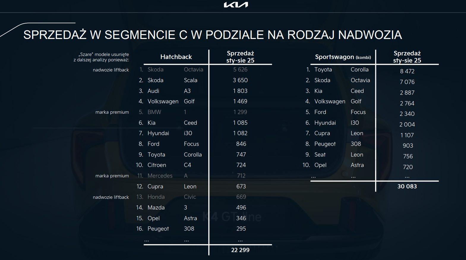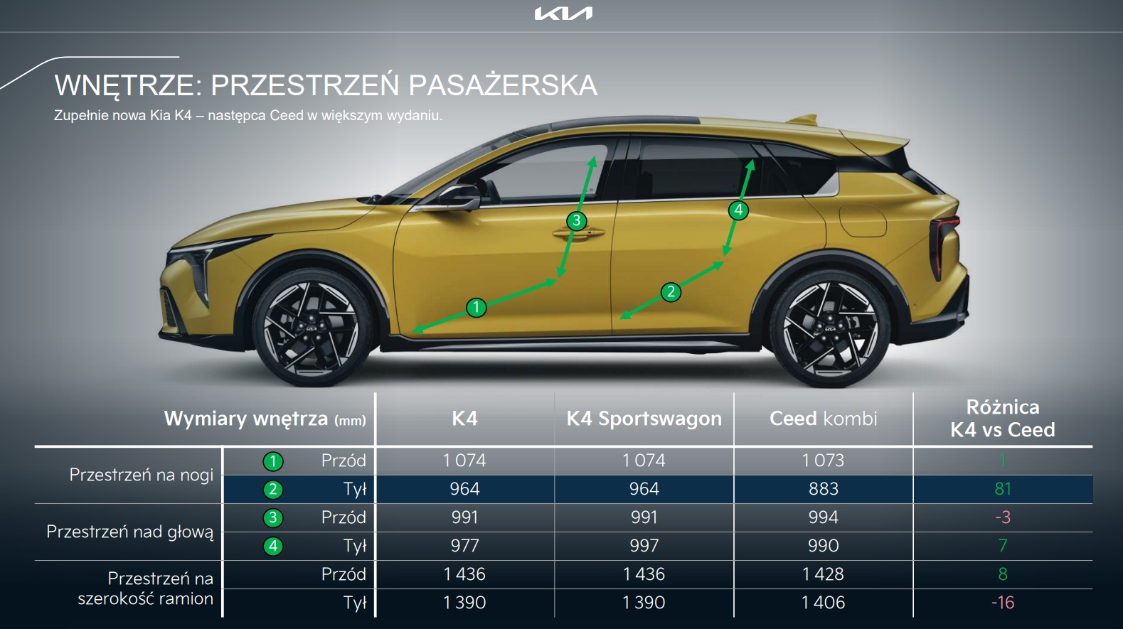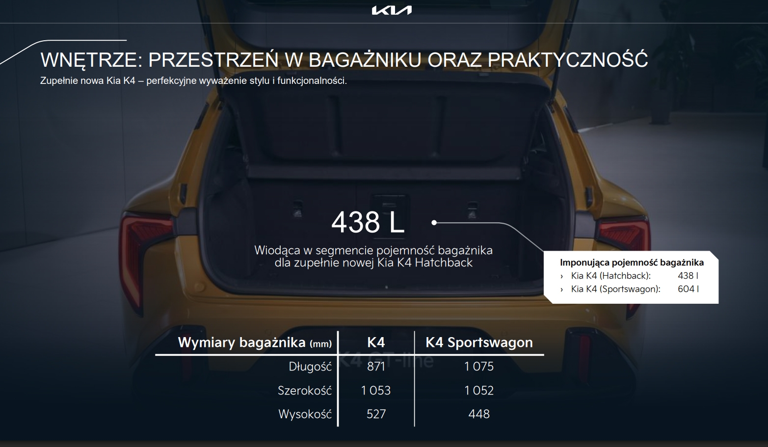 Sportwagon zachowa nowoczesny, dynamiczny styl znany z K4 Hatchback, ale otrzyma wydłużoną linię nadwozia i bardziej pojemną część bagażową. Charakterystyczne agresywne reflektory, wysoka linia pasa i nowoczesny tył z pełną listwą świetlną sprawiają, że auto wygląda jednocześnie sportowo i elegancko.